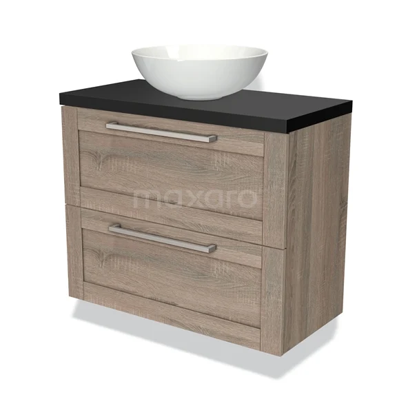 Modulo Plato Slim Badmöbel mit Aufsatzwaschbecken | 80 cm Eiche Rahmen front Matt Schwarz blatt 2 übereinanderliegende Schubladen
