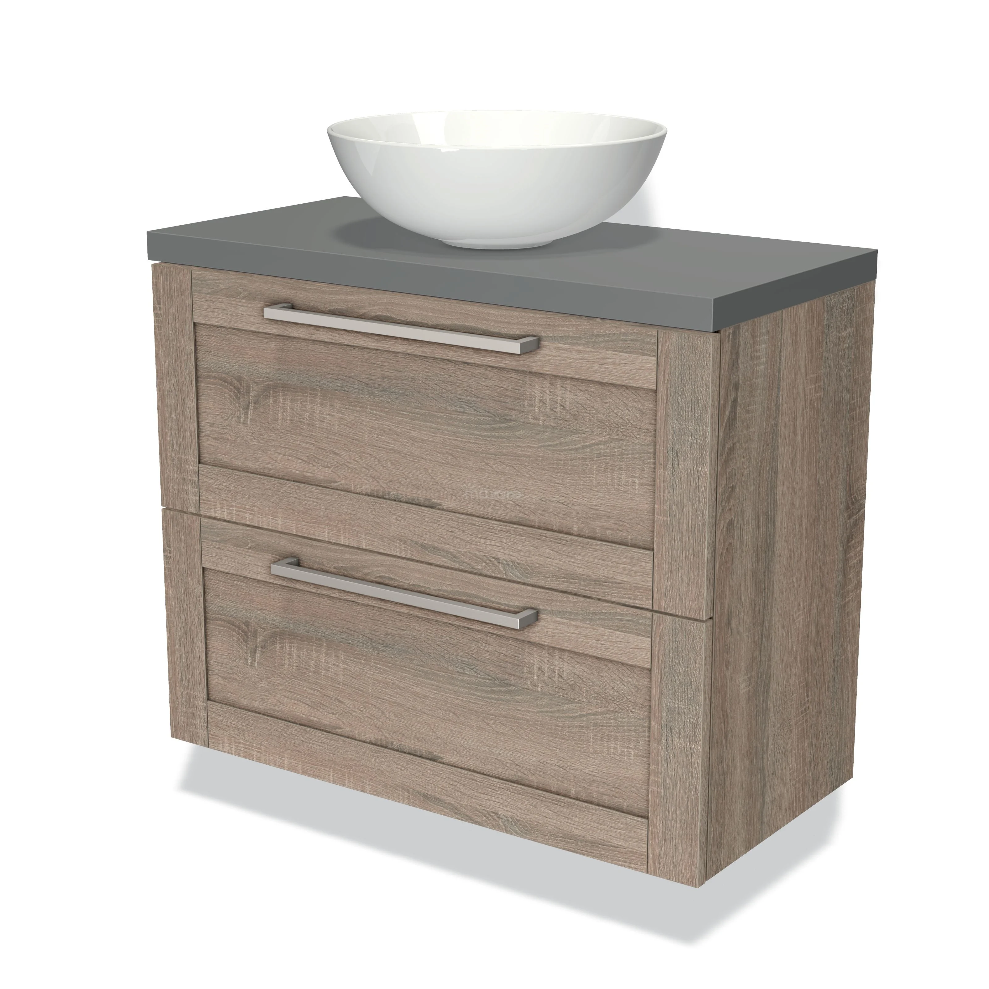 Modulo Plato Slim Badmöbel mit Aufsatzwaschbecken | 80 cm Eiche Rahmen front Mittelgrau blatt 2 übereinanderliegende Schubladen