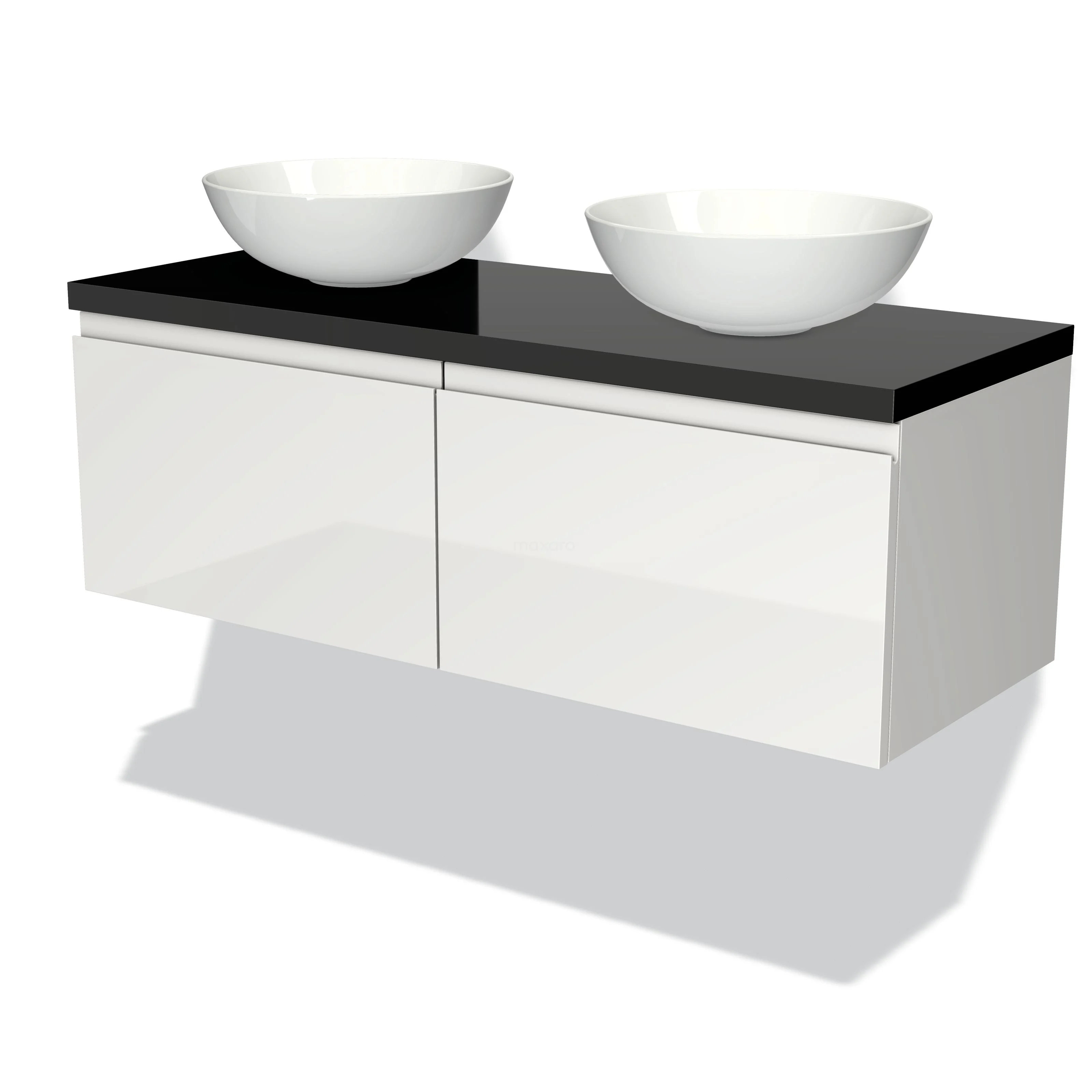 Hochglanz-Badmöbel für Aufsatzwaschbecken 120cm Modulo Plato Hochglanz Weiß 2 Schubladen Grifflos Hochglanz Schwarz Platte