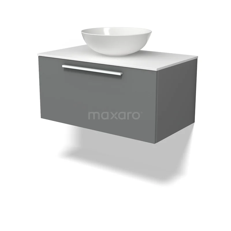 Grauer, hängender Badschrank mit Schublade und weißem Aufsatzwaschbecken, minimalistisches Design aus hochwertigem Material.