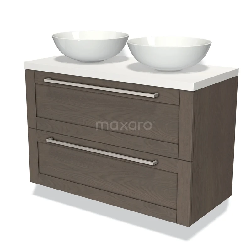 Modulo Plato Badmöbel mit Aufsatzwaschbecken | 100 cm Dunkelbraune Eiche Rahmen front Matt Weiß blatt 2 übereinanderliegende Schubladen