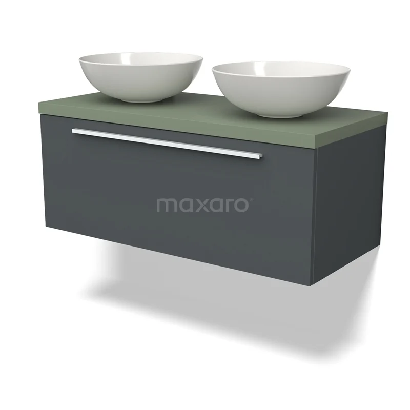 Modulo Plato Badmöbel mit Aufsatzwaschbecken | 100 cm Dunkelgrau Flach front Salbeigrün blatt 1 Schublade