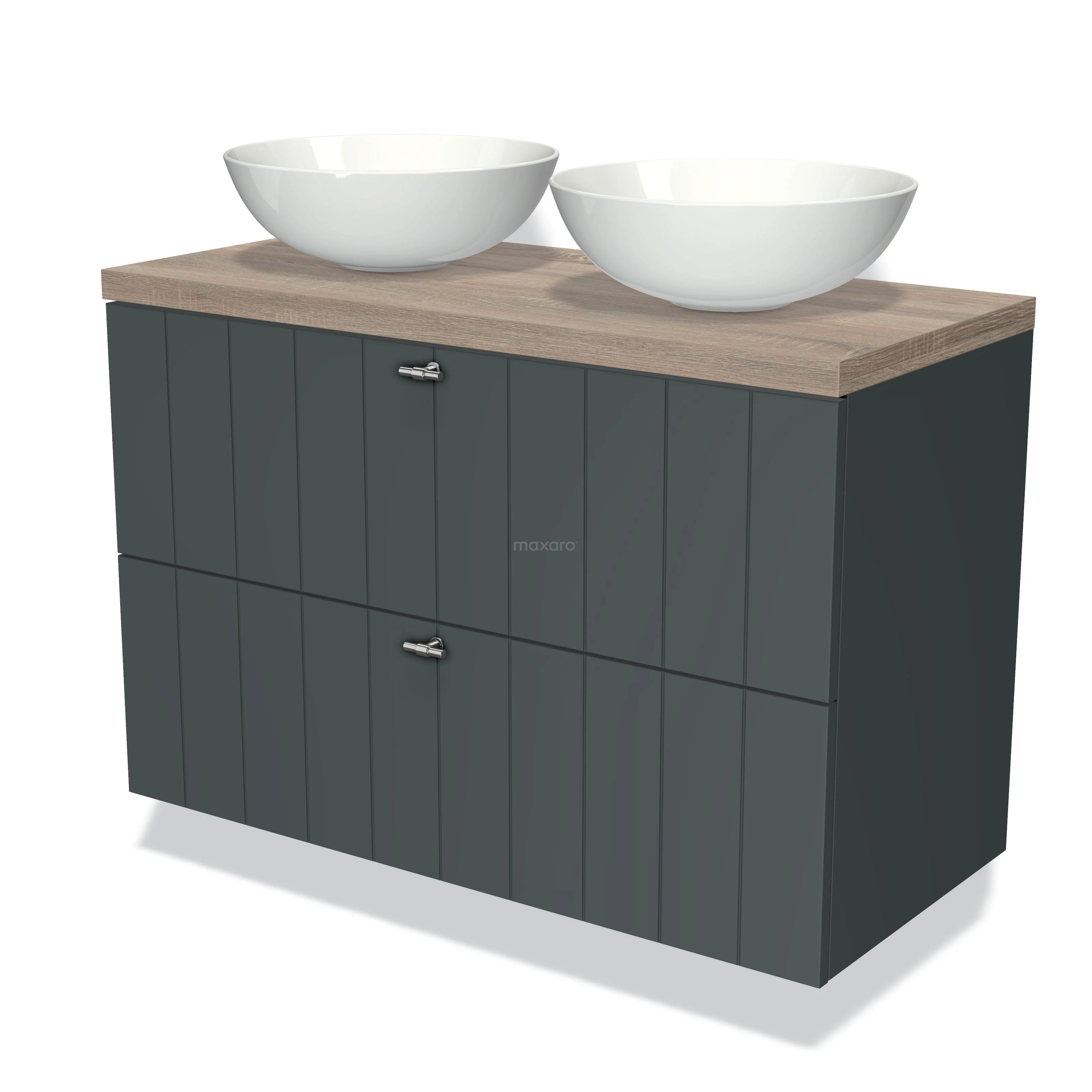 Modulo Plato Badmöbel mit Aufsatzwaschbecken | 100 cm Dunkelgrau Lamelle front Eiche blatt 2 übereinanderliegende Schubladen
