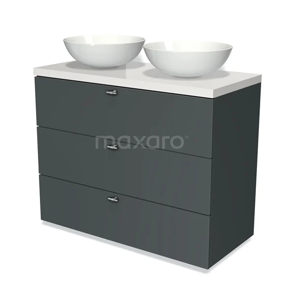 Modulo Plato Badmöbel mit Aufsatzwaschbecken | 100 cm Dunkelgrau Lamelle front Hochglanz Weiß blatt 3 Schubladen