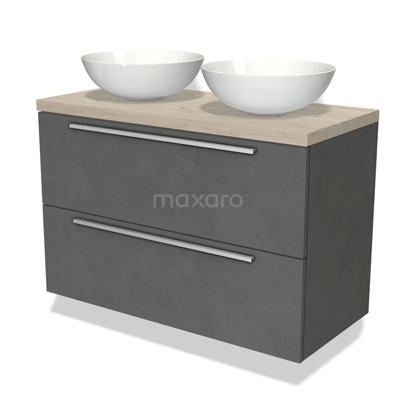 Modulo Plato Badmöbel mit Aufsatzwaschbecken | 100 cm Dunkelgrauer Beton Flach front Hellgraue Eiche blatt 2 übereinanderliegende Schubladen