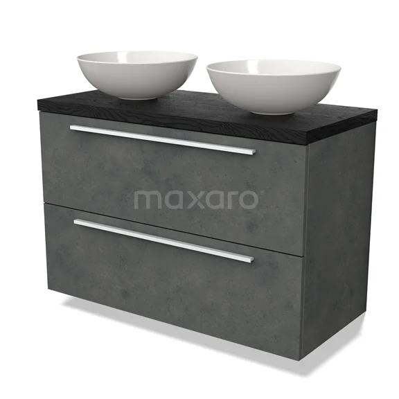 Modulo Plato Badmöbel mit Aufsatzwaschbecken | 100 cm Dunkelgrauer Beton Flach front Schwarze Eiche blatt 2 übereinanderliegende Schubladen