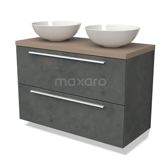 Modulo Plato Badmöbel mit Aufsatzwaschbecken | 100 cm Dunkelgrauer Beton Flach front Taupe blatt 2 übereinanderliegende Schubladen