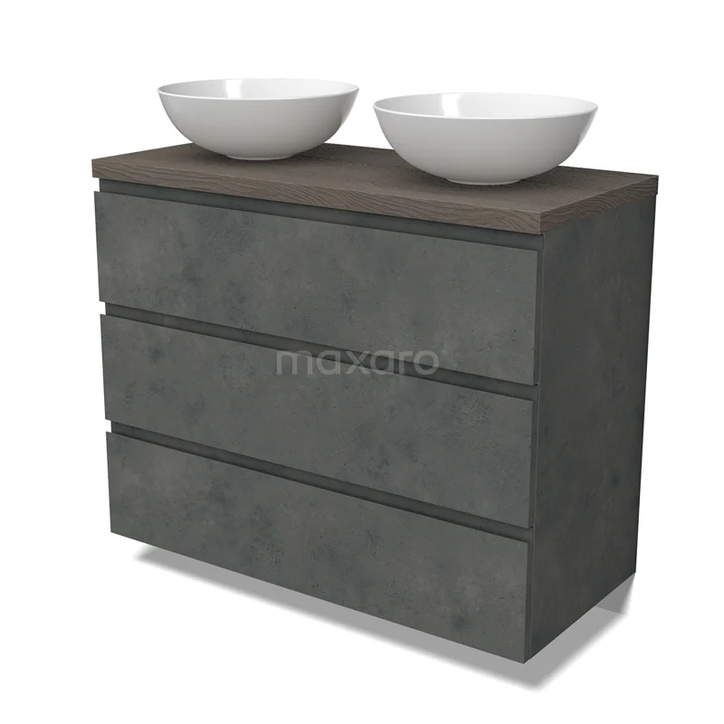 Modulo Plato Badmöbel mit Aufsatzwaschbecken | 100 cm Dunkelgrauer Beton Grifflos front Dunkelbraune Eiche blatt 3 Schubladen
