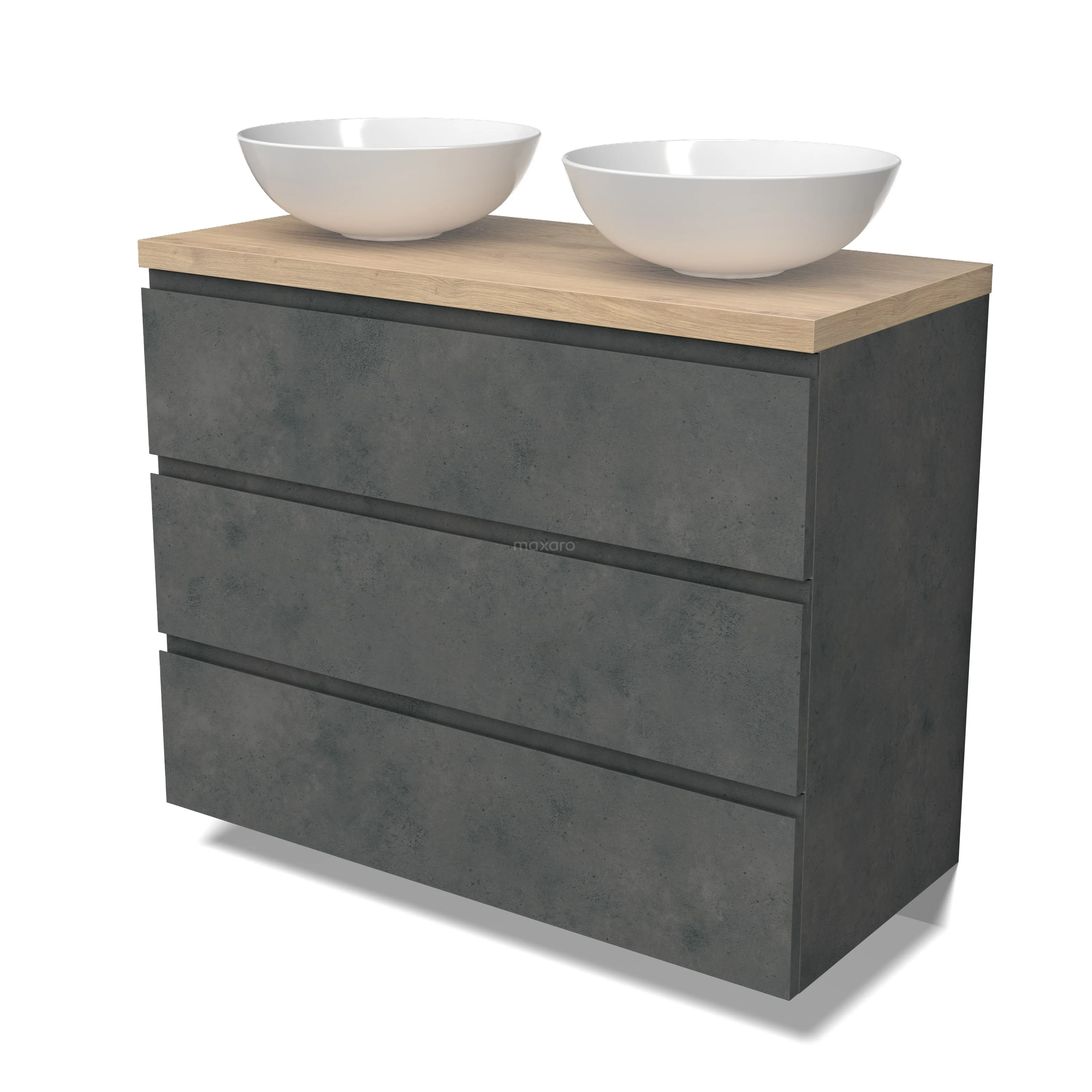 Modulo Plato Badmöbel mit Aufsatzwaschbecken | 100 cm Dunkelgrauer Beton Grifflos front Hellbraune Eiche blatt 3 Schubladen