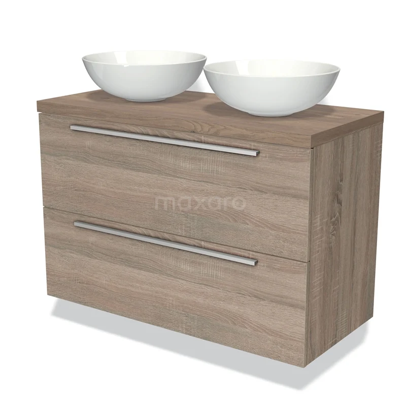 Modulo Plato Badmöbel mit Aufsatzwaschbecken | 100 cm Eiche Flach front Mittelbraune Eiche blatt 2 übereinanderliegende Schubladen