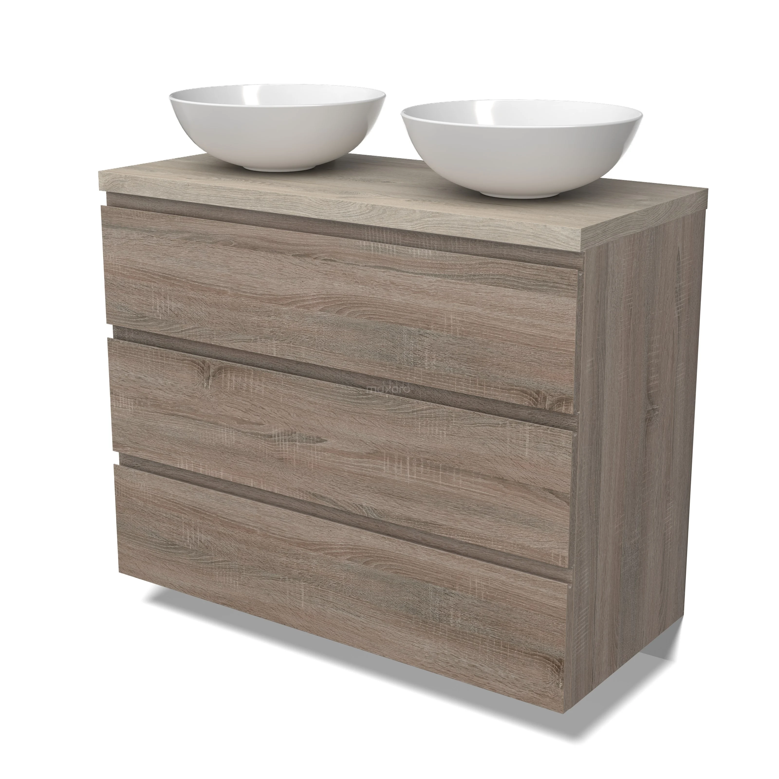 Modulo Plato Badmöbel mit Aufsatzwaschbecken | 100 cm Eiche Grifflos front Hellgraue Eiche blatt 3 Schubladen
