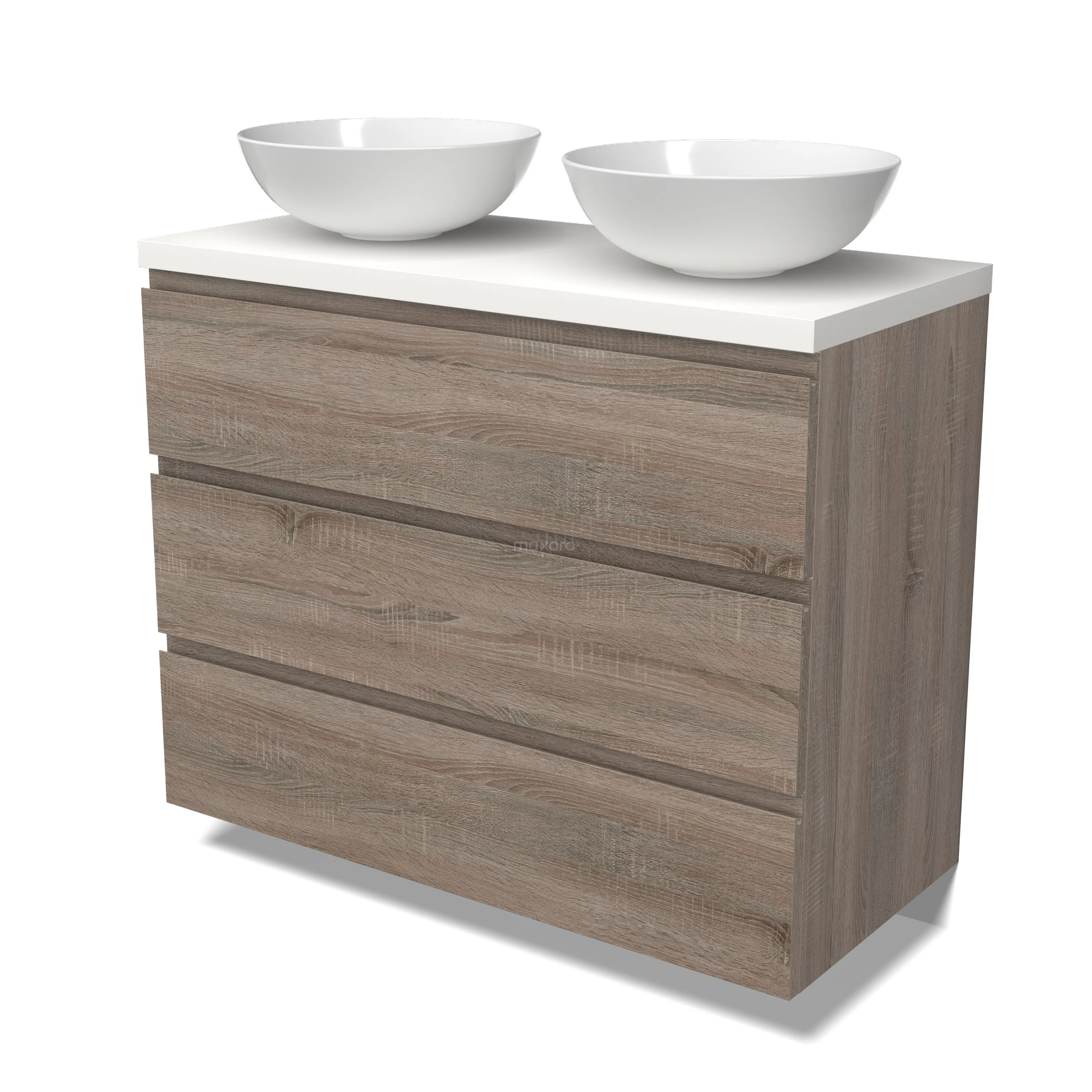 Modulo Plato Badmöbel mit Aufsatzwaschbecken | 100 cm Eiche Grifflos front Matt Weiß blatt 3 Schubladen