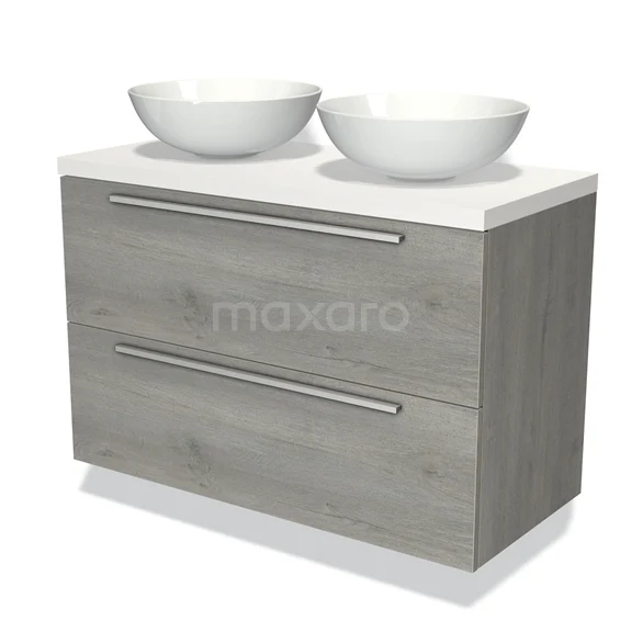 Modulo Plato Badmöbel mit Aufsatzwaschbecken | 100 cm Graue Eiche Flach front Matt Weiß blatt 2 übereinanderliegende Schubladen
