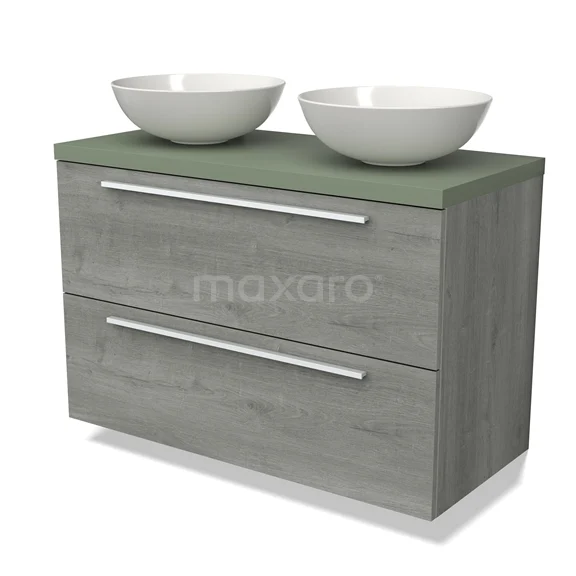 Modulo Plato Badmöbel mit Aufsatzwaschbecken | 100 cm Graue Eiche Flach front Salbeigrün blatt 2 übereinanderliegende Schubladen