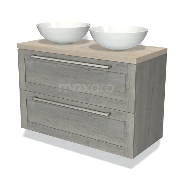 Modulo Plato Badmöbel mit Aufsatzwaschbecken | 100 cm Graue Eiche Rahmen front Hellgraue Eiche blatt 2 übereinanderliegende Schubladen