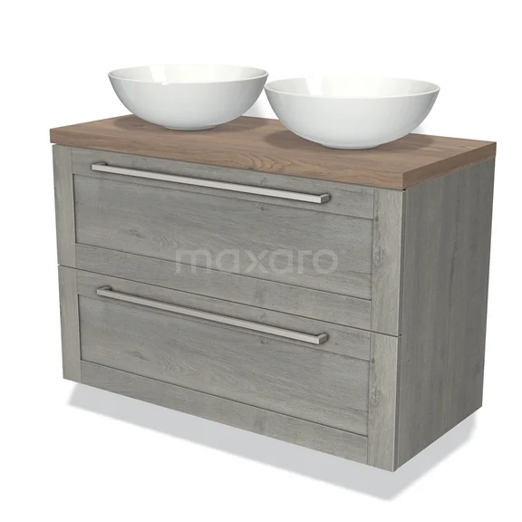 Modulo Plato Badmöbel mit Aufsatzwaschbecken | 100 cm Graue Eiche Rahmen front Mittelbraune Eiche blatt 2 übereinanderliegende Schubladen