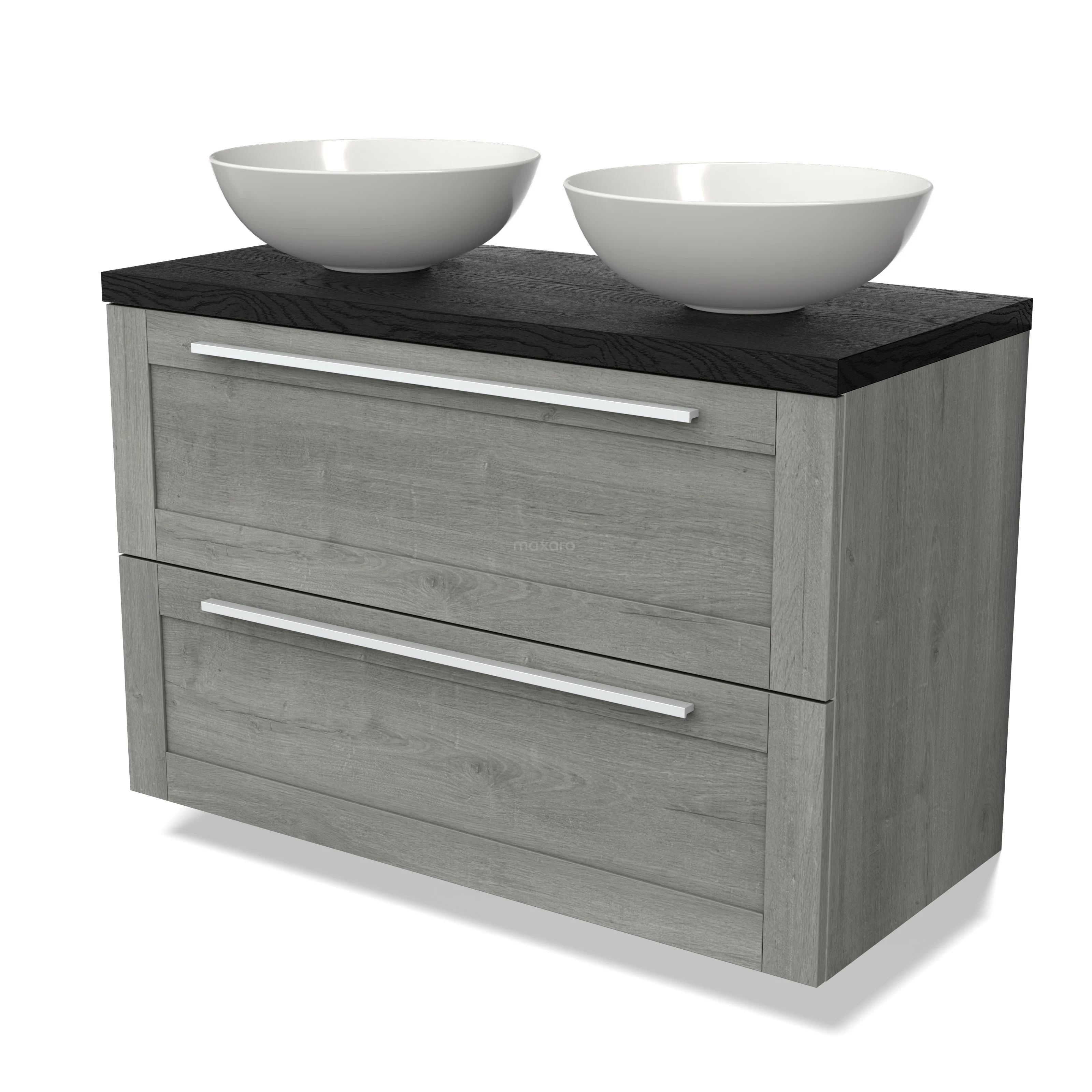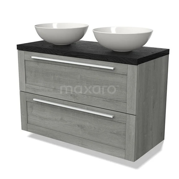 Modulo Plato Badmöbel mit Aufsatzwaschbecken | 100 cm Graue Eiche Rahmen front Schwarze Eiche blatt 2 übereinanderliegende Schubladen