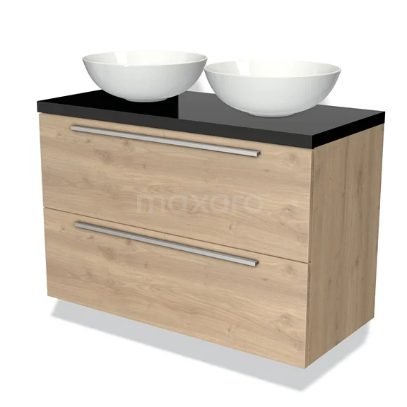 Modulo Plato Badmöbel mit Aufsatzwaschbecken | 100 cm Hellbraune Eiche Flach front Hochglanz Schwarz blatt 2 übereinanderliegende Schubladen