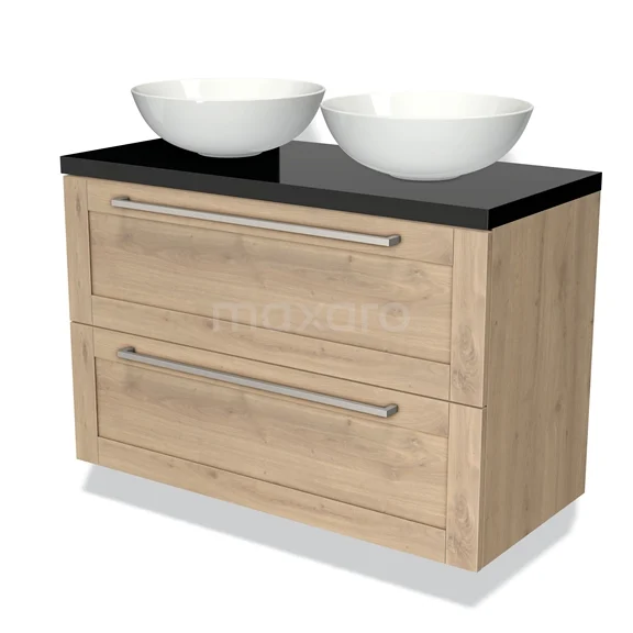 Modulo Plato Badmöbel mit Aufsatzwaschbecken | 100 cm Hellbraune Eiche Rahmen front Hochglanz Weiß blatt 2 übereinanderliegende Schubladen