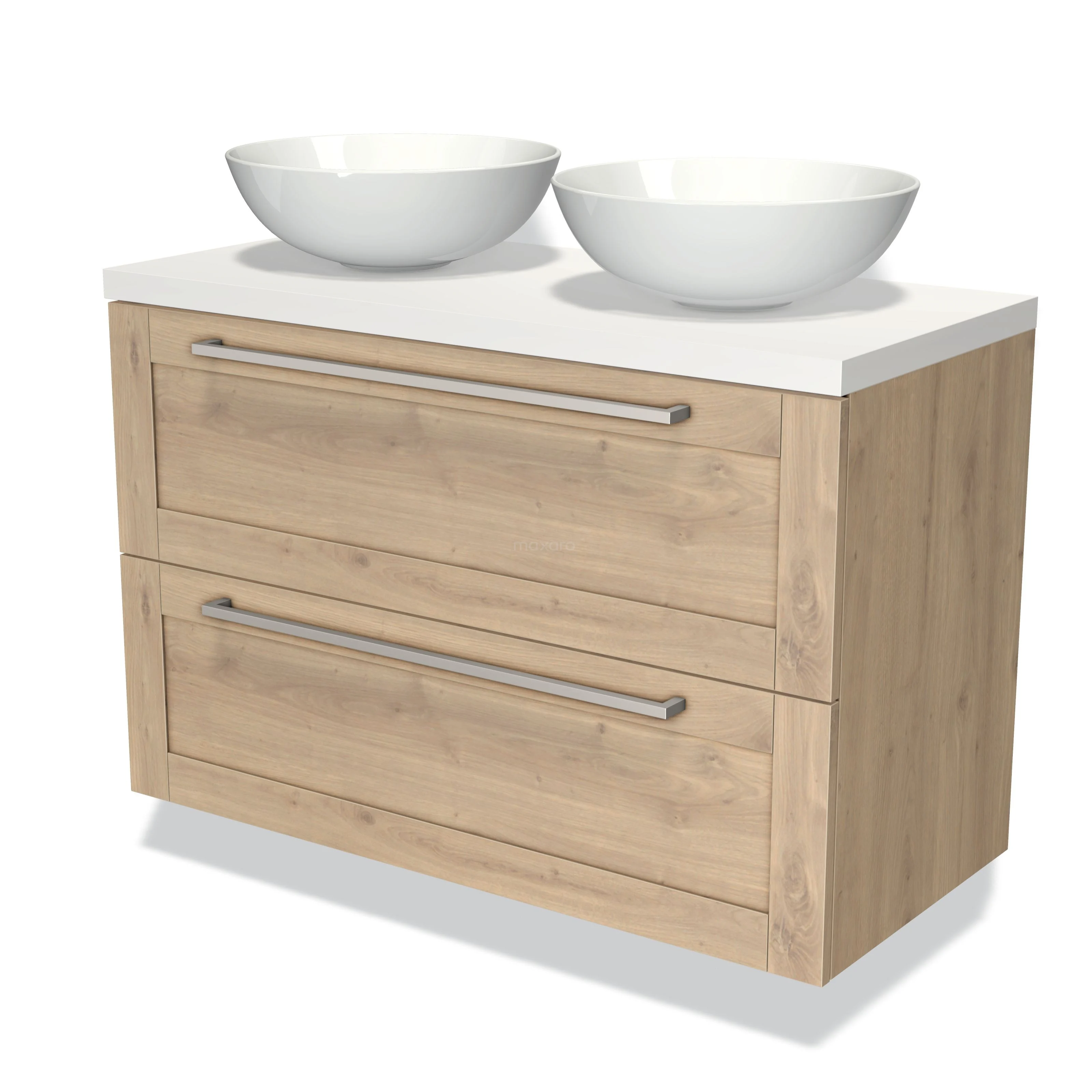 Modulo Plato Badmöbel mit Aufsatzwaschbecken | 100 cm Hellbraune Eiche Rahmen front Matt Weiß blatt 2 übereinanderliegende Schubladen