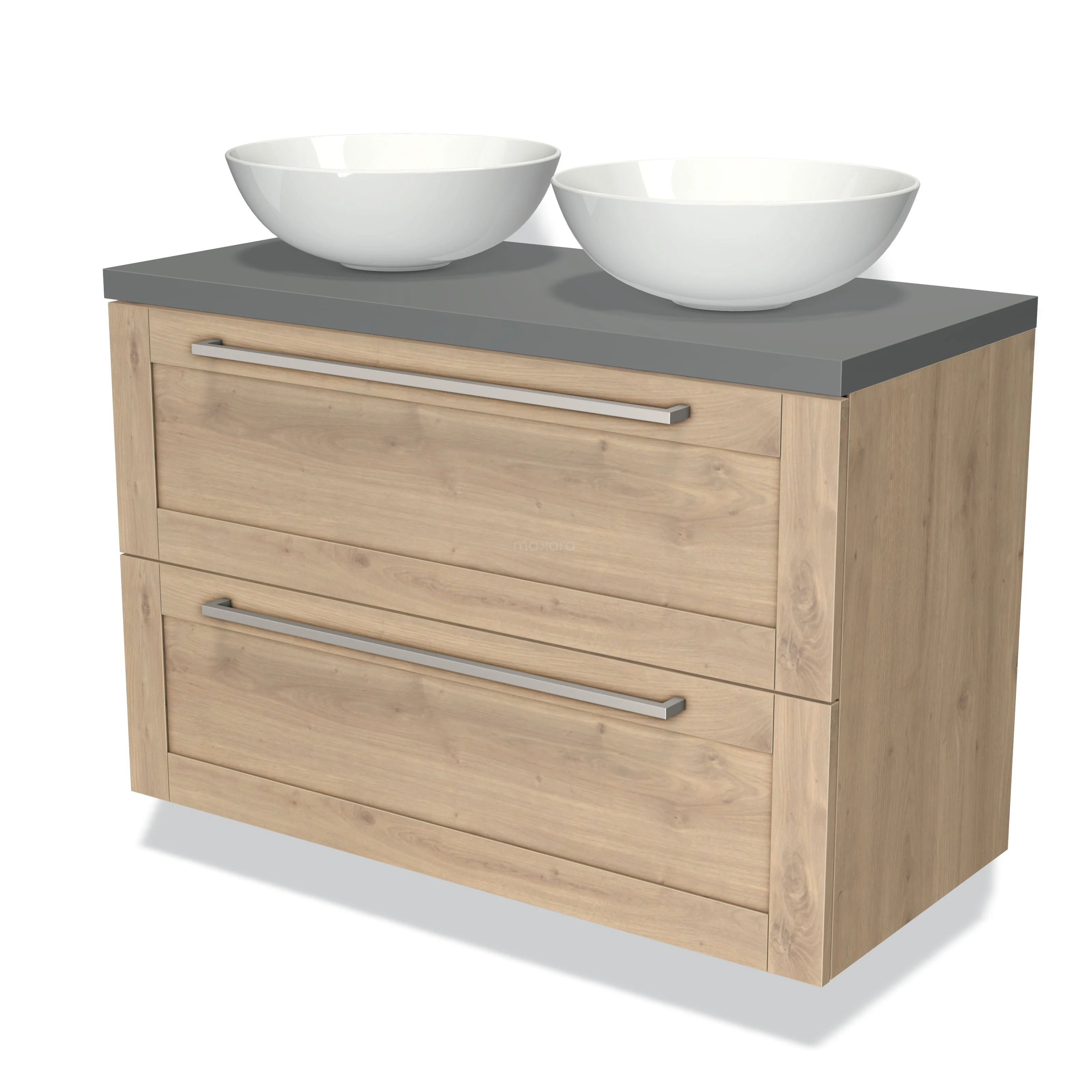 Modulo Plato Badmöbel mit Aufsatzwaschbecken | 100 cm Hellbraune Eiche Rahmen front Mittelgrau blatt 2 übereinanderliegende Schubladen
