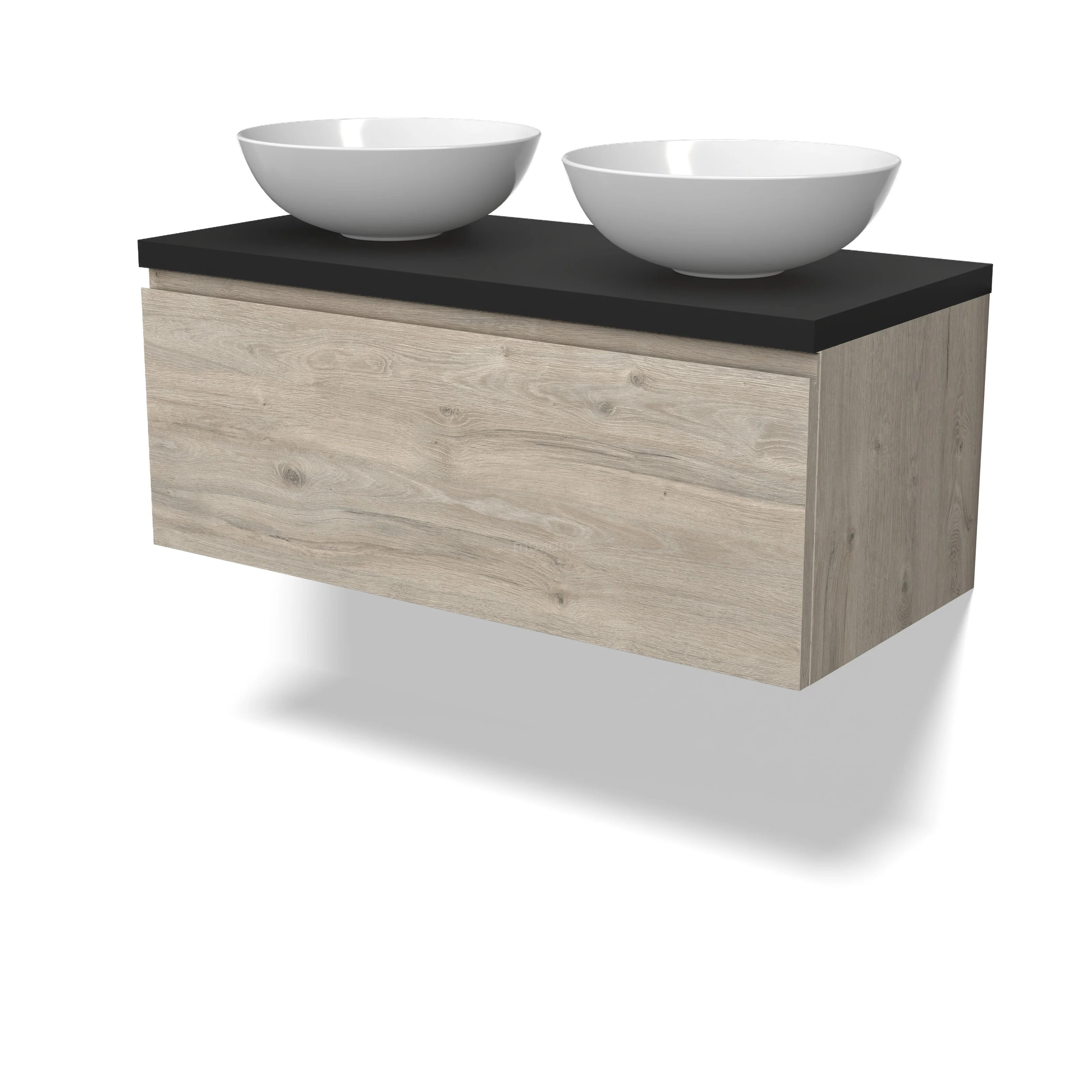 Modulo Plato Badmöbel mit Aufsatzwaschbecken | 100 cm Hellgraue Eiche Grifflos front Matt Schwarz blatt 1 Schublade