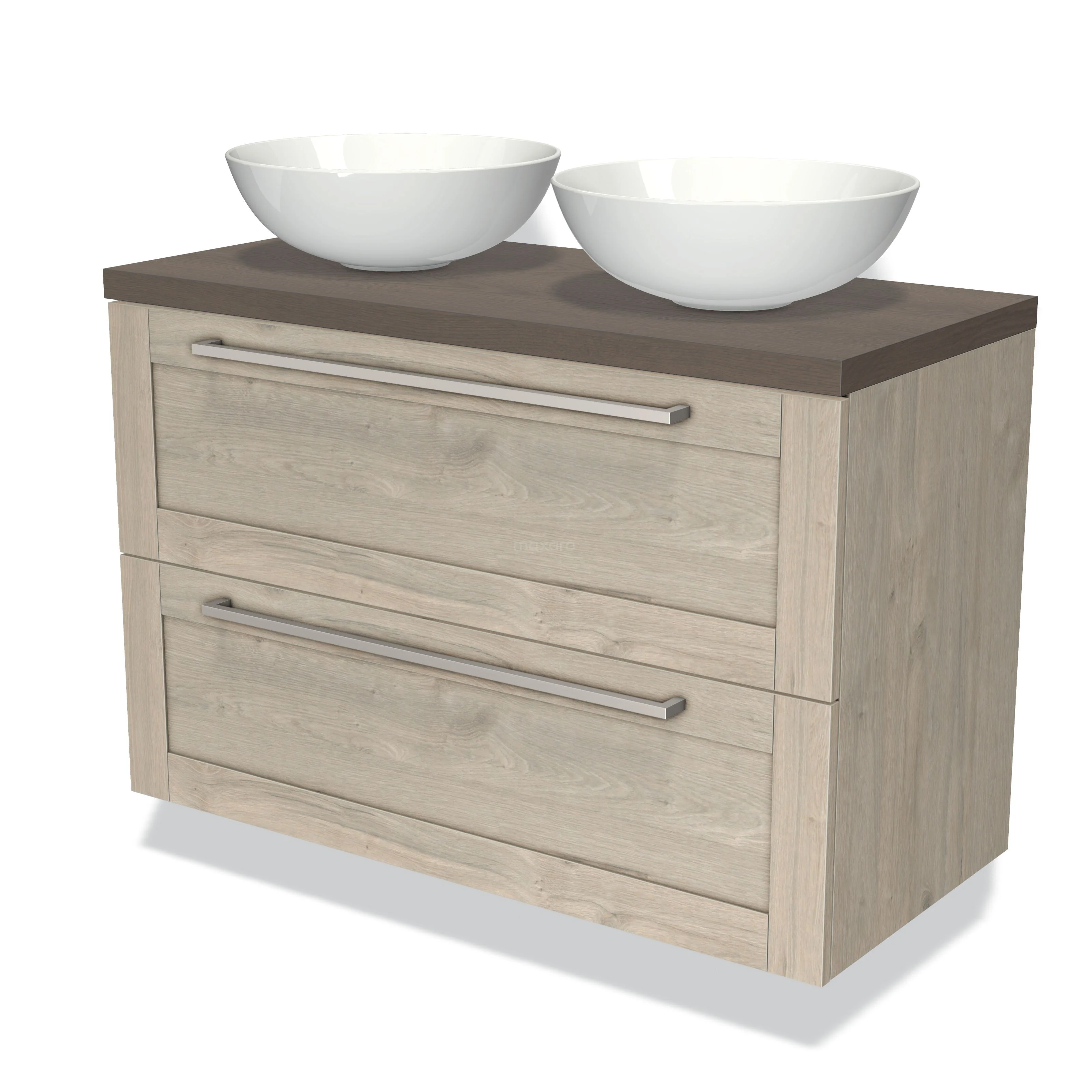 Modulo Plato Badmöbel mit Aufsatzwaschbecken | 100 cm Hellgraue Eiche Rahmen front Dunkelbraune Eiche blatt 2 übereinanderliegende Schubladen