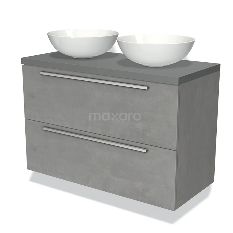 Modulo Plato Badmöbel mit Aufsatzwaschbecken | 100 cm Hellgrauer Beton Flach front Mittelgrau blatt 2 übereinanderliegende Schubladen