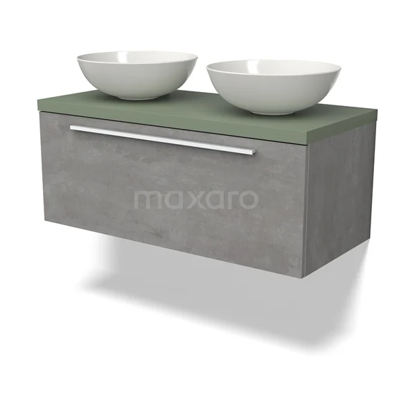 Modulo Plato Badmöbel mit Aufsatzwaschbecken | 100 cm Hellgrauer Beton Flach front Salbeigrün blatt 1 Schublade