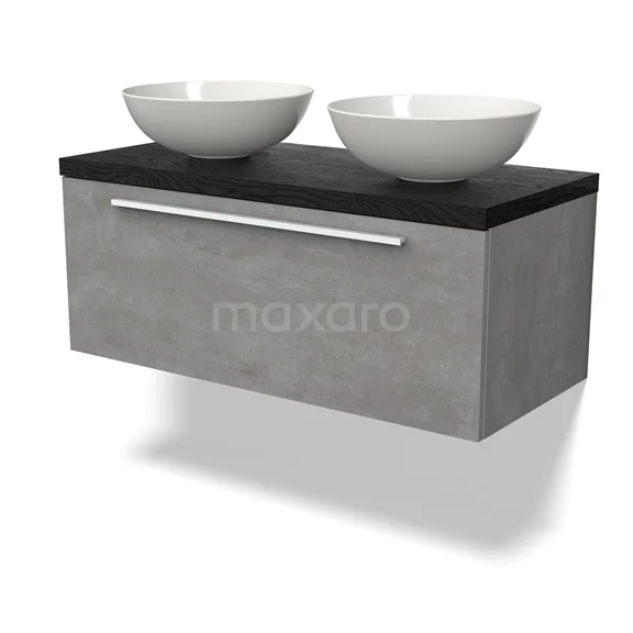 Modulo Plato Badmöbel mit Aufsatzwaschbecken | 100 cm Hellgrauer Beton Flach front Schwarze Eiche blatt 1 Schublade