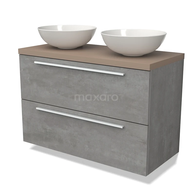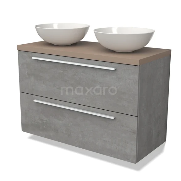 Modulo Plato Badmöbel mit Aufsatzwaschbecken | 100 cm Hellgrauer Beton Flach front Taupe blatt 2 übereinanderliegende Schubladen