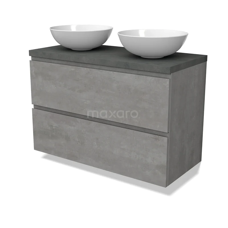 Modulo Plato Badmöbel mit Aufsatzwaschbecken | 100 cm Hellgrauer Beton Grifflos front Dunkelgrauer Beton blatt 2 übereinanderliegende Schubladen