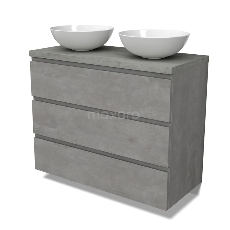 Modulo Plato Badmöbel mit Aufsatzwaschbecken | 100 cm Hellgrauer Beton Grifflos front Graue Eiche blatt 3 Schubladen