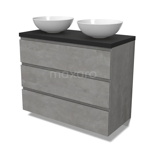 Modulo Plato Badmöbel mit Aufsatzwaschbecken | 100 cm Hellgrauer Beton Grifflos front Matt Schwarz blatt 3 Schubladen