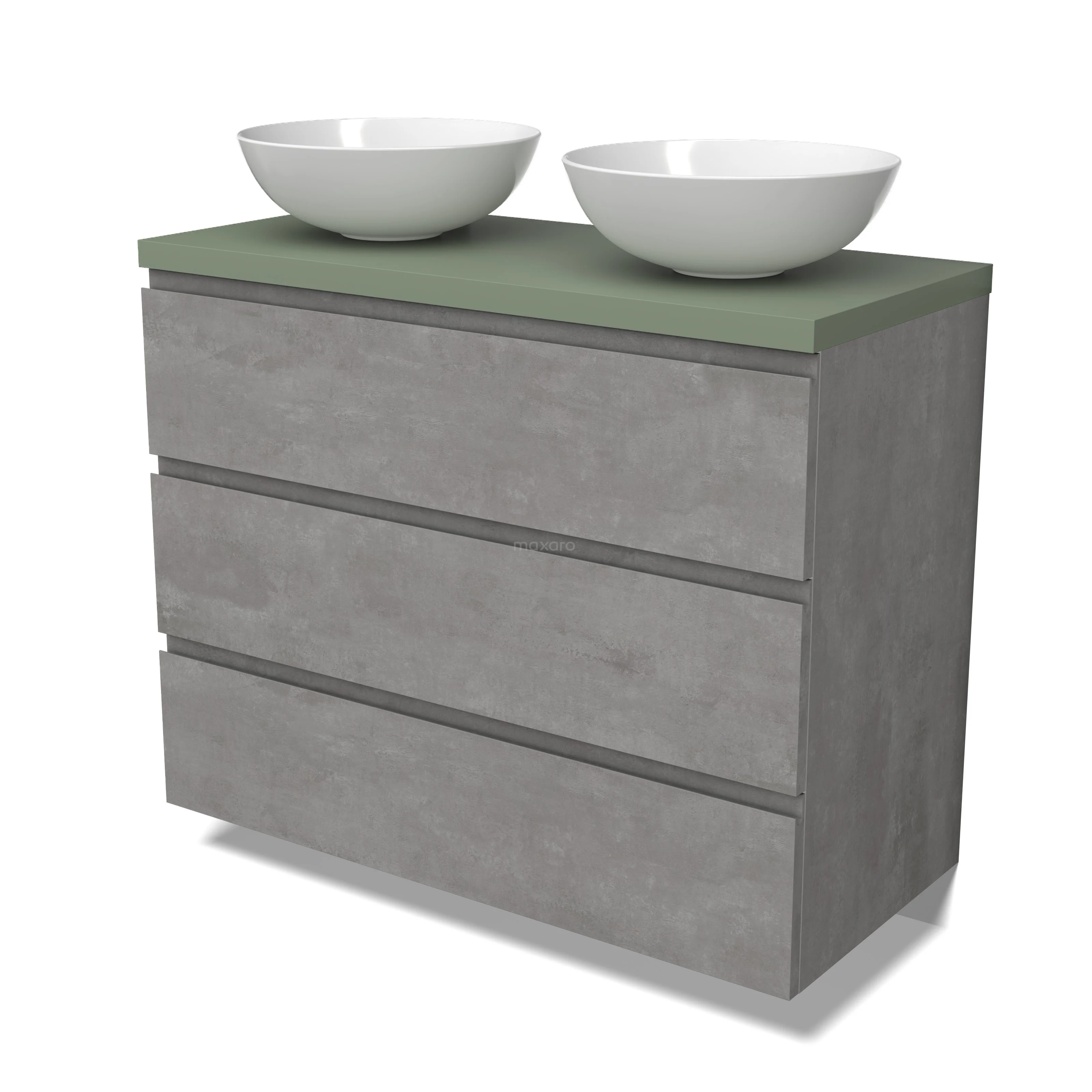 Modulo Plato Badmöbel mit Aufsatzwaschbecken | 100 cm Hellgrauer Beton Grifflos front Salbeigrün blatt 3 Schubladen