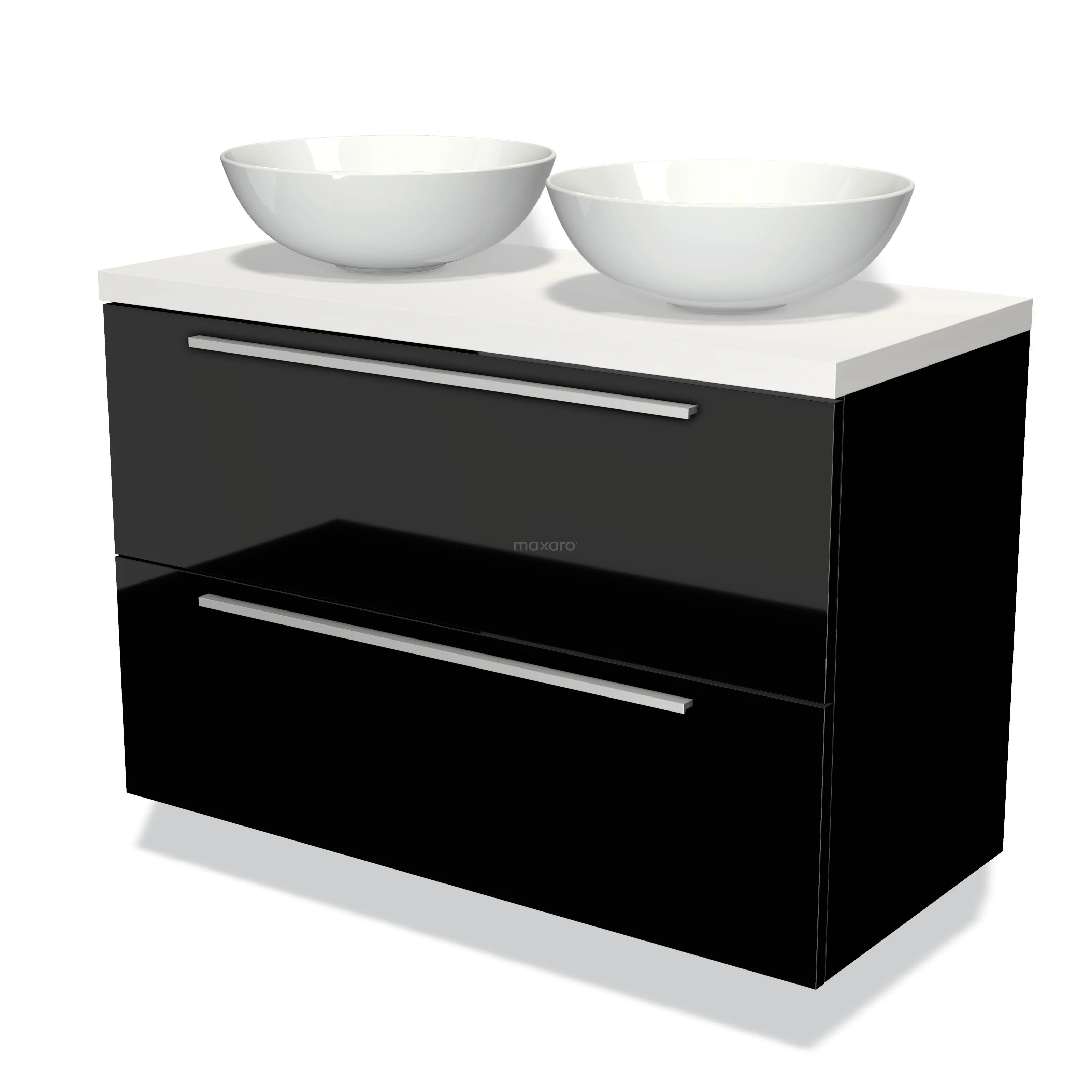 Modulo Plato Badmöbel mit Aufsatzwaschbecken | 100 cm Hochglanz Schwarz Flach front Matt Weiß blatt 2 übereinanderliegende Schubladen