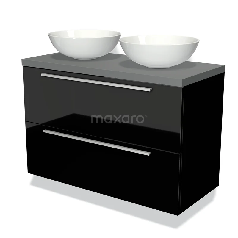 Modulo Plato Badmöbel mit Aufsatzwaschbecken | 100 cm Hochglanz Schwarz Flach front Mittelgrau blatt 2 übereinanderliegende Schubladen