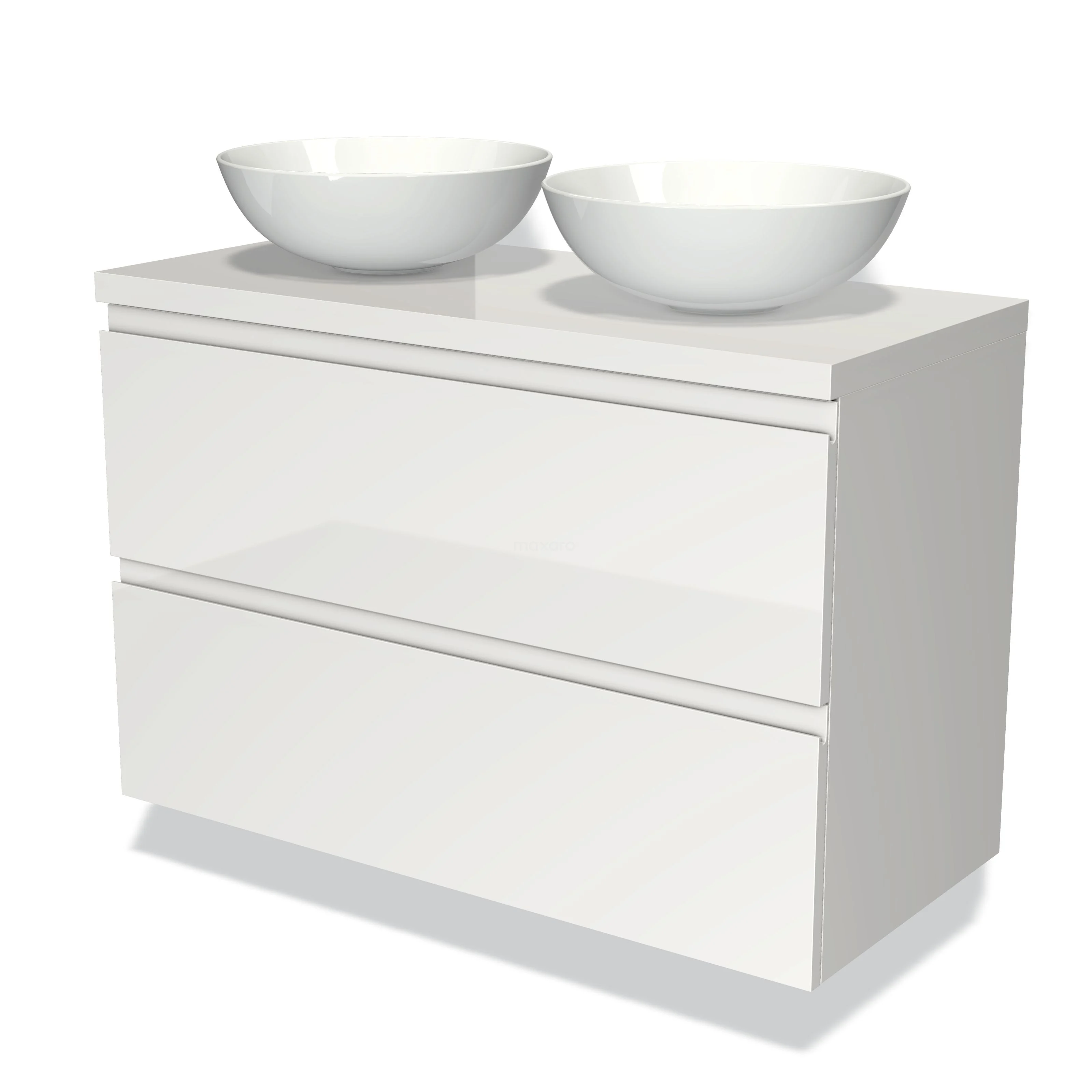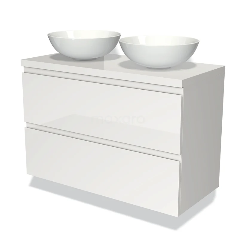 Modulo Plato Badmöbel mit Aufsatzwaschbecken | 100 cm Hochglanz Weiß Grifflos front Hochglanz Weiß blatt 2 übereinanderliegende Schubladen