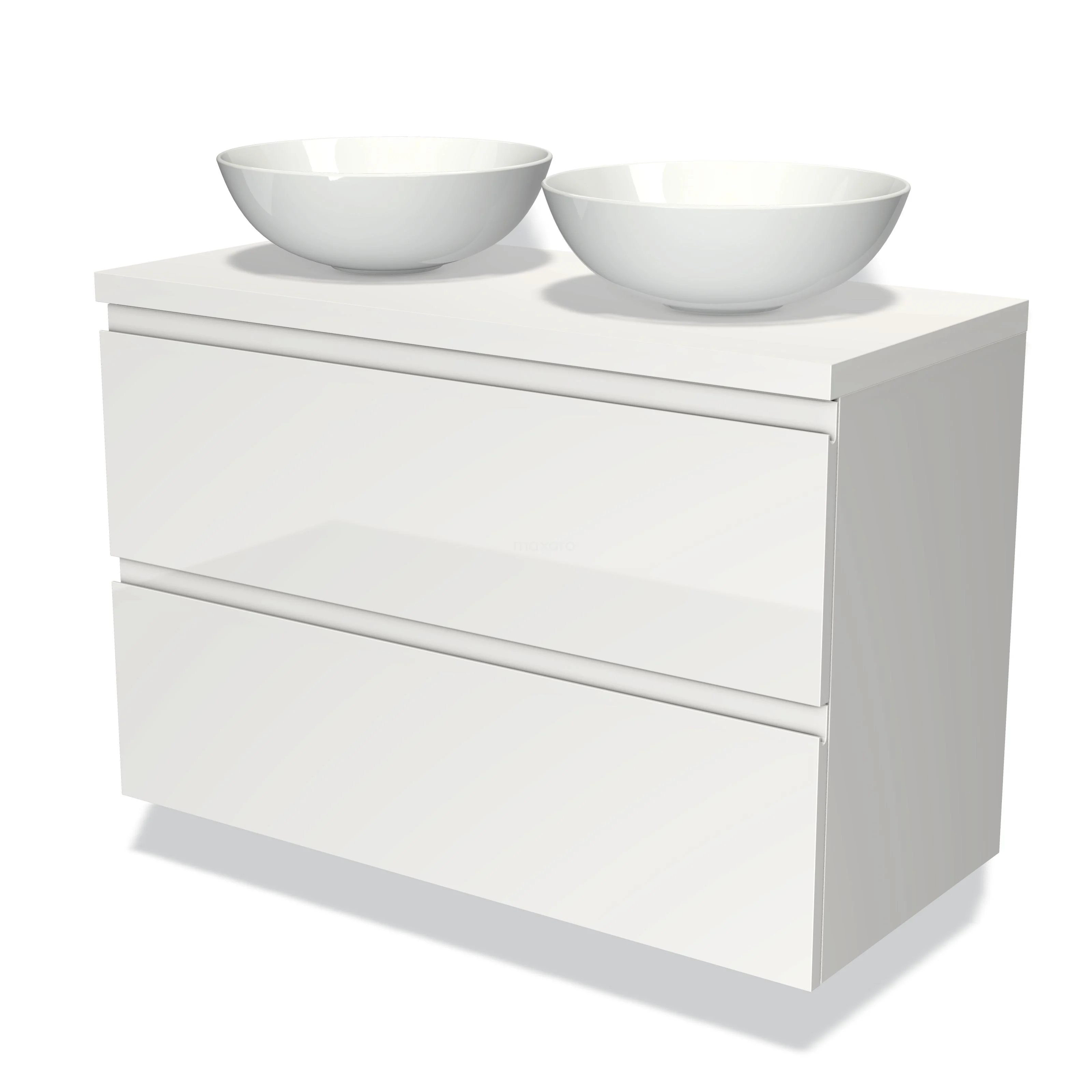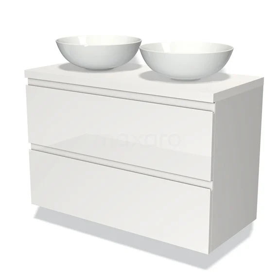 Modulo Plato Badmöbel mit Aufsatzwaschbecken | 100 cm Hochglanz Weiß Grifflos front Matt Weiß blatt 2 übereinanderliegende Schubladen