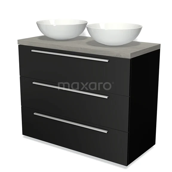 Modulo Plato Badmöbel mit Aufsatzwaschbecken | 100 cm Matt Schwarz Flach front Graue Eiche blatt 3 Schubladen