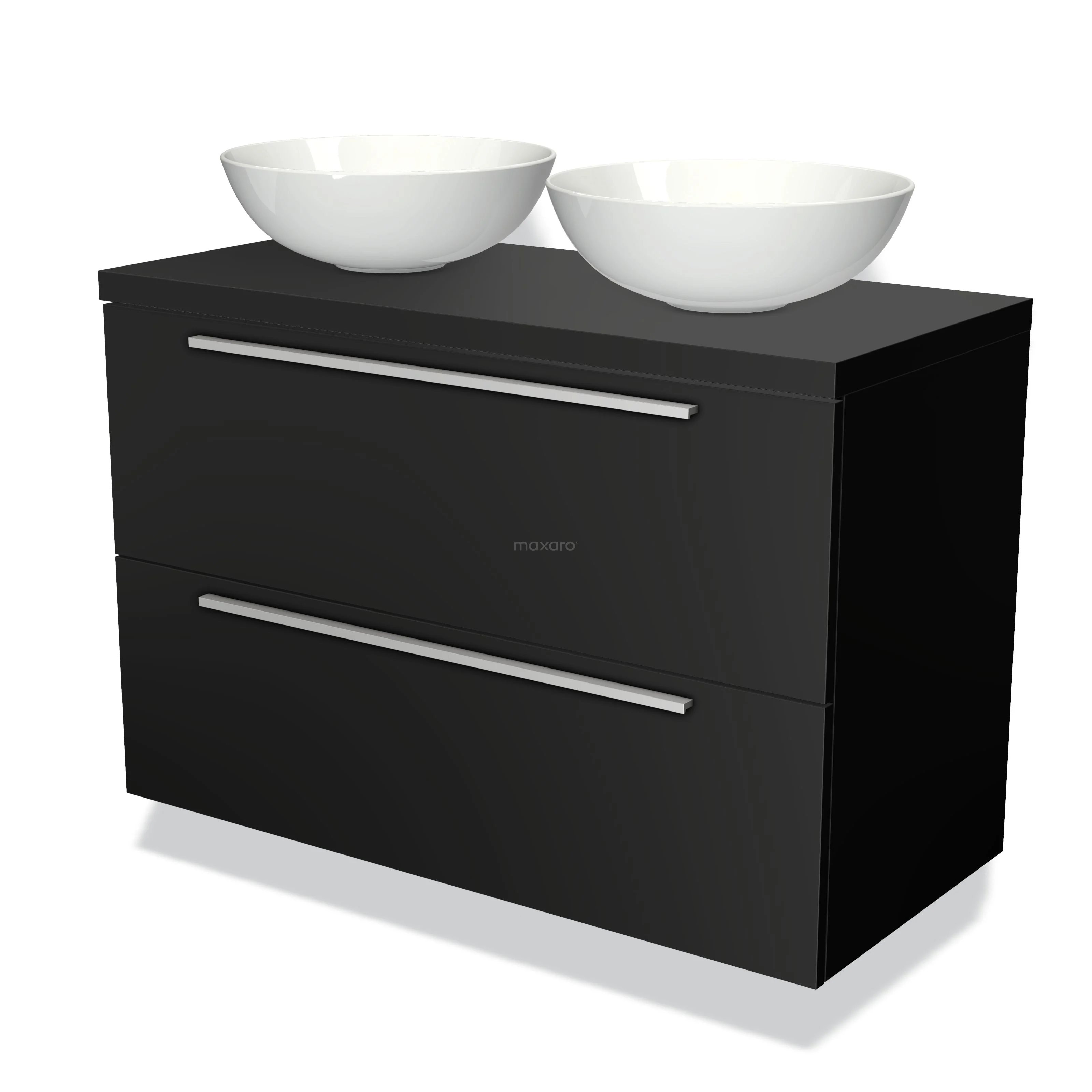 Modulo Plato Badmöbel mit Aufsatzwaschbecken | 100 cm Matt Schwarz Flach front Matt Schwarz blatt 2 übereinanderliegende Schubladen