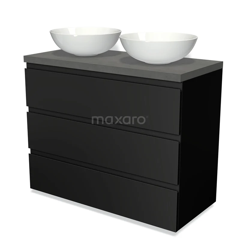 Modulo Plato Badmöbel mit Aufsatzwaschbecken | 100 cm Matt Schwarz Grifflos front Dunkelgrauer Beton blatt 3 Schubladen