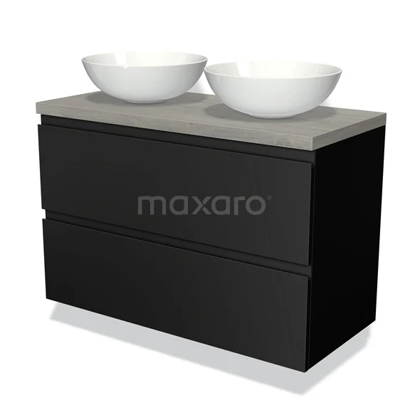 Modulo Plato Badmöbel mit Aufsatzwaschbecken | 100 cm Matt Schwarz Grifflos front Graue Eiche blatt 2 übereinanderliegende Schubladen