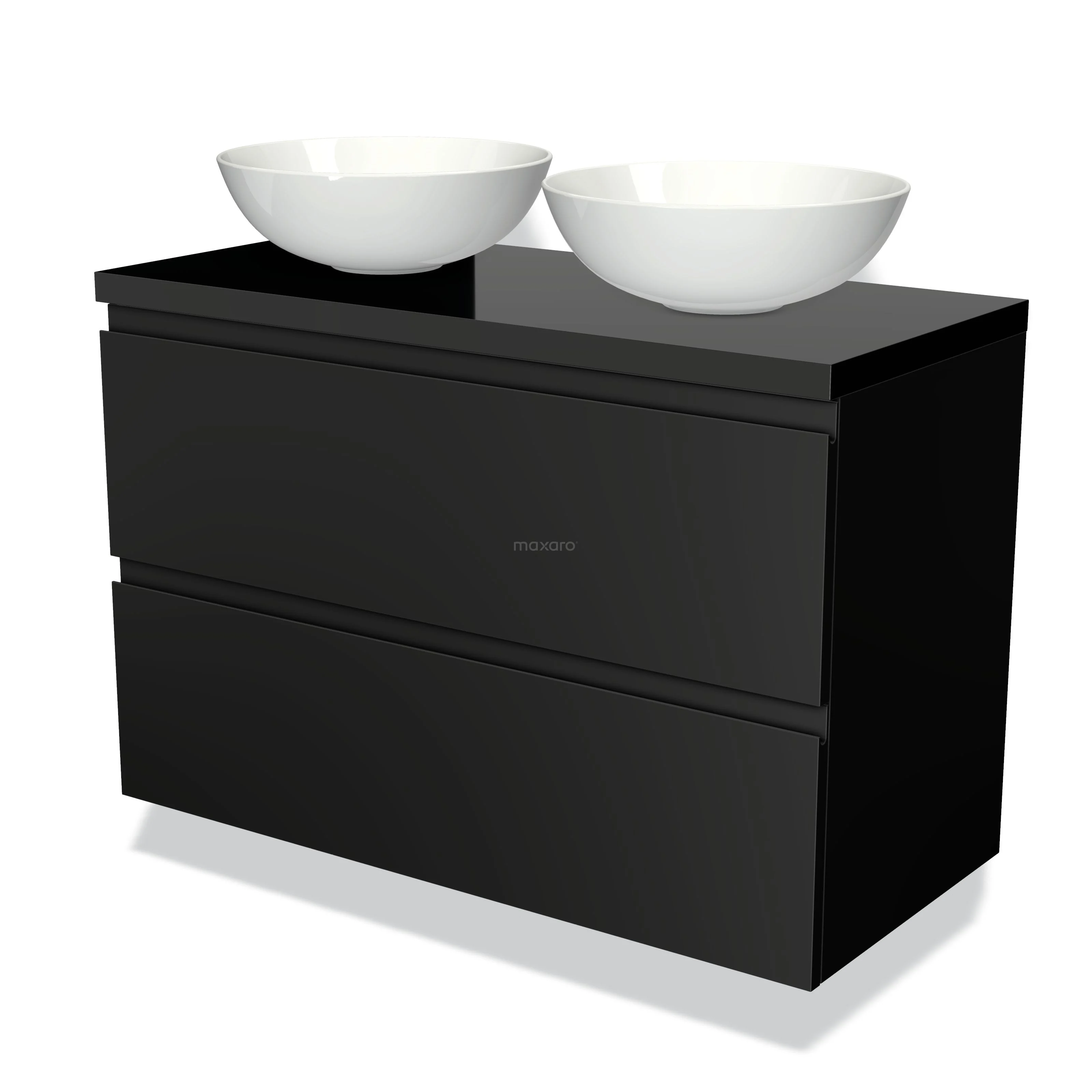 Modulo Plato Badmöbel mit Aufsatzwaschbecken | 100 cm Matt Schwarz Grifflos front Hochglanz Schwarz blatt 2 übereinanderliegende Schubladen