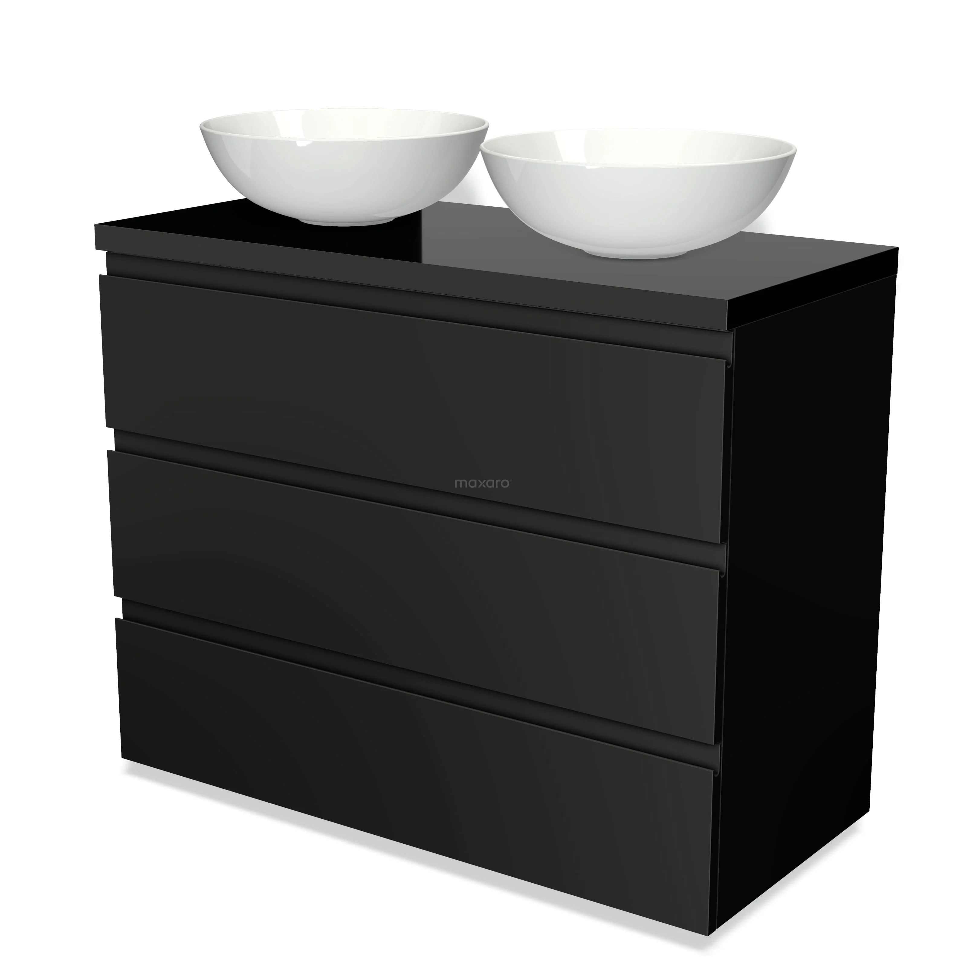 Modulo Plato Badmöbel mit Aufsatzwaschbecken | 100 cm Matt Schwarz Grifflos front Hochglanz Schwarz blatt 3 Schubladen