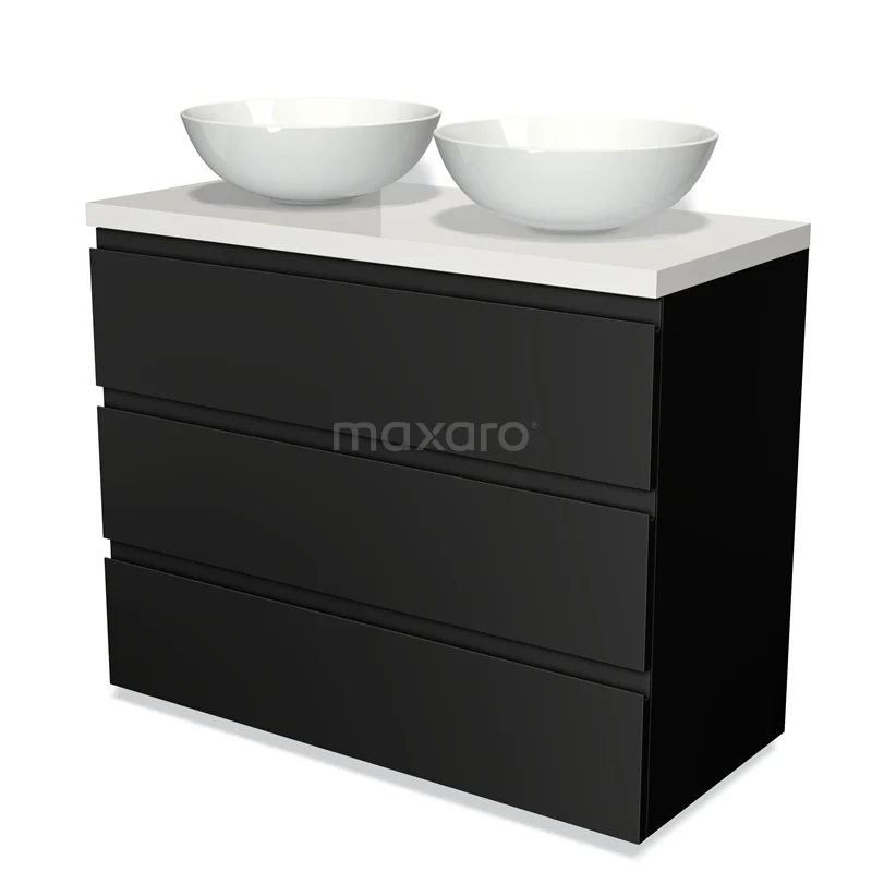 Modulo Plato Badmöbel mit Aufsatzwaschbecken | 100 cm Matt Schwarz Grifflos front Hochglanz Weiß blatt 3 Schubladen
