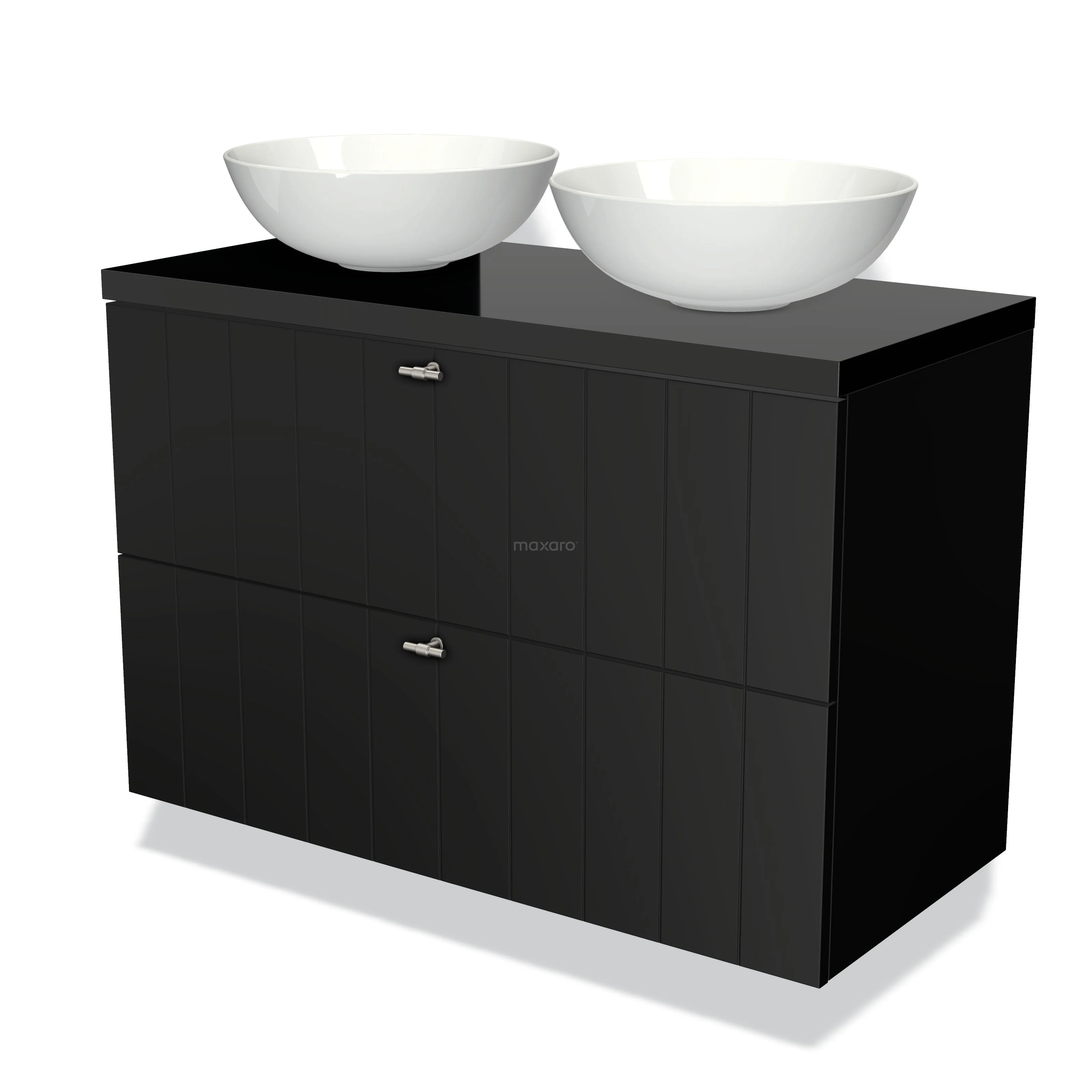 Modulo Plato Badmöbel mit Aufsatzwaschbecken | 100 cm Matt Schwarz Lamelle front Hochglanz Schwarz blatt 2 übereinanderliegende Schubladen