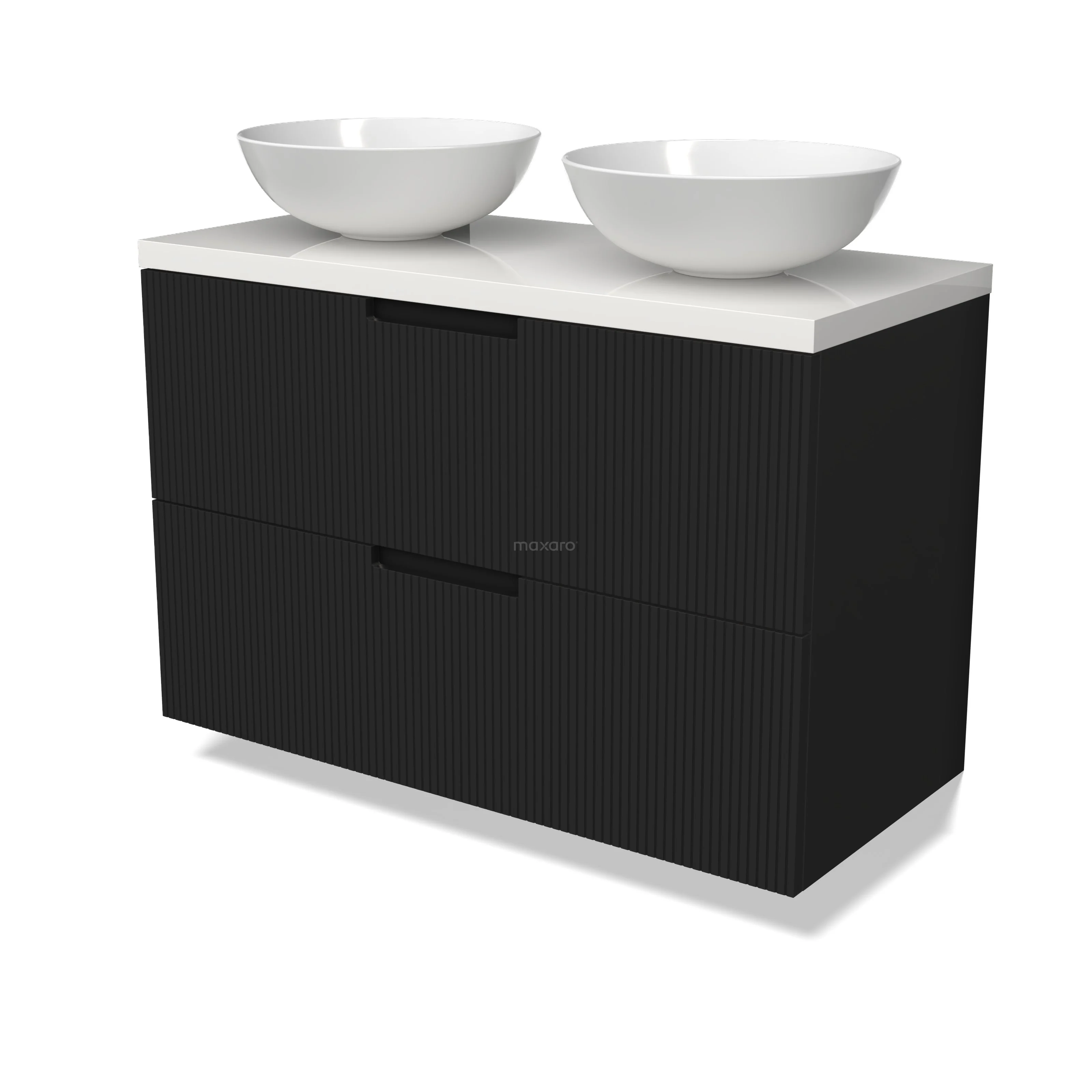 Modulo Plato Badmöbel mit Aufsatzwaschbecken | 100 cm Matt Schwarz Linie front Hochglanz Weiß blatt 2 übereinanderliegende Schubladen