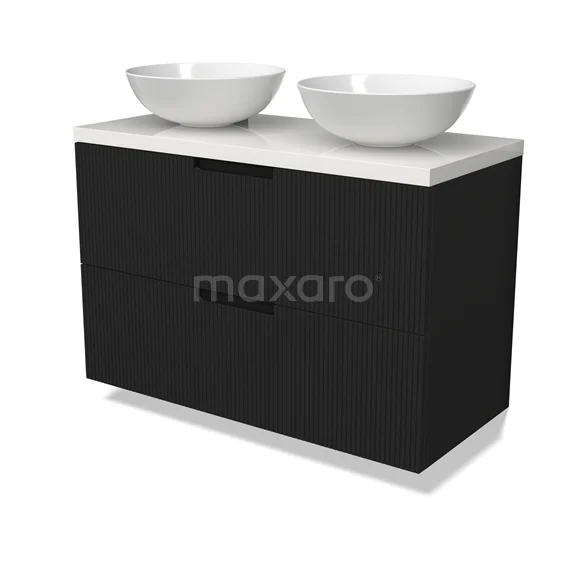 Modulo Plato Badmöbel mit Aufsatzwaschbecken | 100 cm Matt Schwarz Linie front Hochglanz Weiß blatt 2 übereinanderliegende Schubladen BMK17-03040