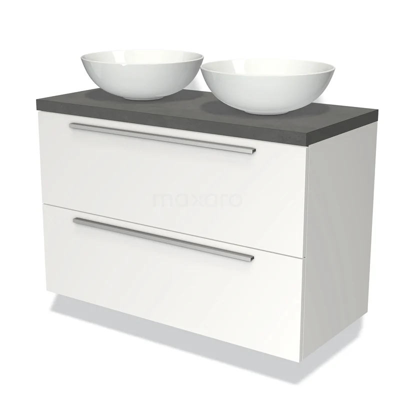 Modulo Plato Badmöbel mit Aufsatzwaschbecken | 100 cm Matt Weiß Flach front Dunkelgrauer Beton blatt 2 übereinanderliegende Schubladen